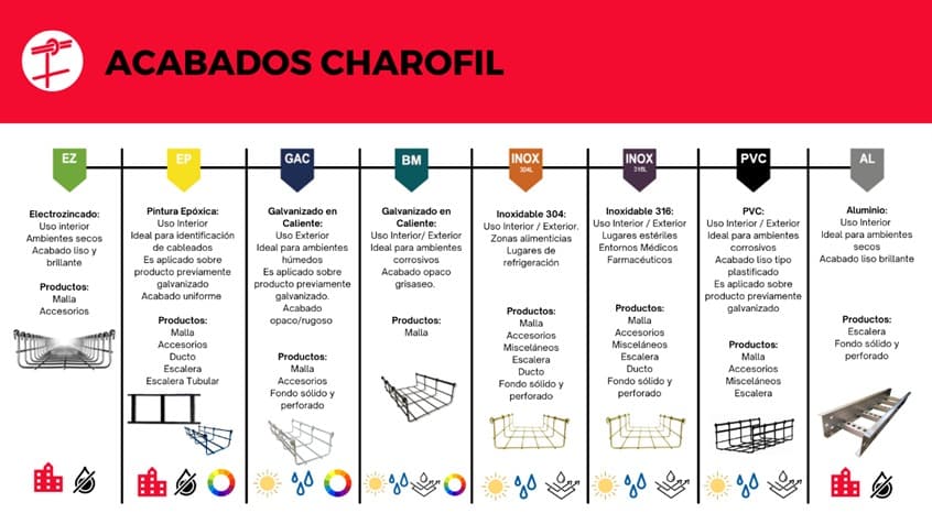 Seleccionar adecuadamente el acabado de tu charola puede evitar fallas tempranas en la canalización y grandes problemas a tu instalación, evitando duplicar costos y grandes pérdidas. La siguiente información te ayudará a identificar el tipo de producto que requieres y su aplicación adecuada.